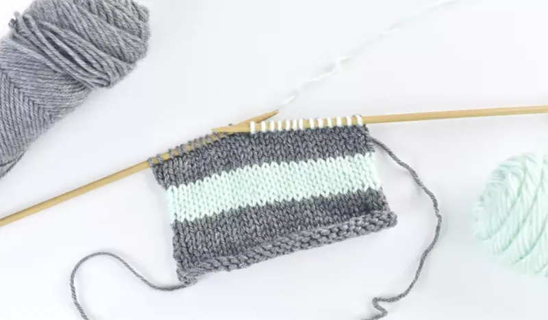 3. Продолжайте вязать по ряду. После первой петли спокойно двигайтесь вдоль ряда новой пряжей. Если вы возвращаетесь к старому цвету или добавляете новые оттенки, принцип остается таким же.