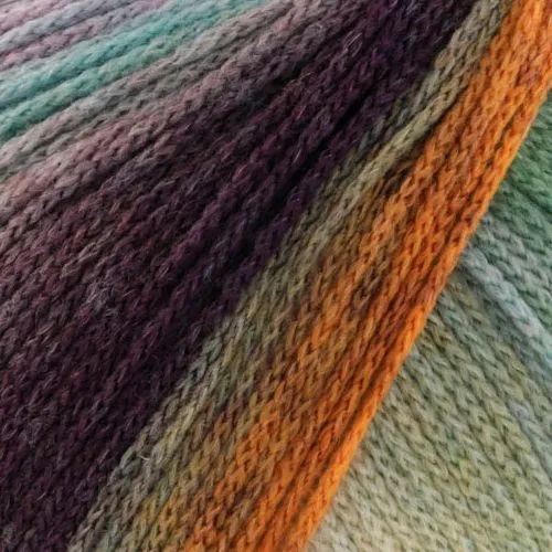 Особенность этой пряжи — цветовой градиент, который естественным образом меняется во время вязания, создавая гармоничную игру оттенков без необходимости сложных узоров или смены пряжи. Характерный полосатый узор позволяет вязать ажурные полотна, которые выглядят оригинально и изысканно.