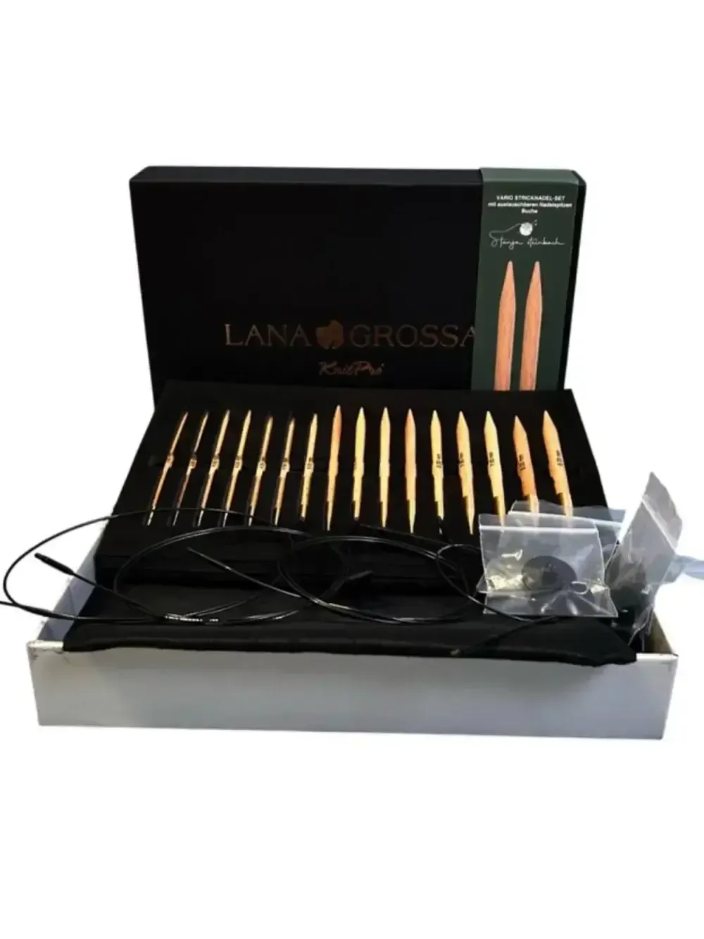 Набор разъёмных спиц Lana Grossa BUCHE Tanha Steinbach Edition включает восемь пар спиц из натурального бука диаметром 3,5, 4,0, 4,5, 5,0, 5,5, 6,0, 7,0 и 8,0 мм. В комплект входят две лески, позволяющие создать круговые спицы общей длиной 60, 80, 100 или 120 см, а также 8 удобных конечников-стопперов и 4 ключа для надежного прикрепления лески к спицам. Этот элегантный и функциональный набор станет прекрасным инструментом для любого проекта вязания.