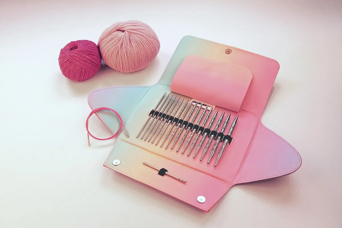 Набор круговых вязальных спиц addiUnicorn с уникальной спиральной структурой представлен в необычном розовом футляре с красивым внутренним убранством.