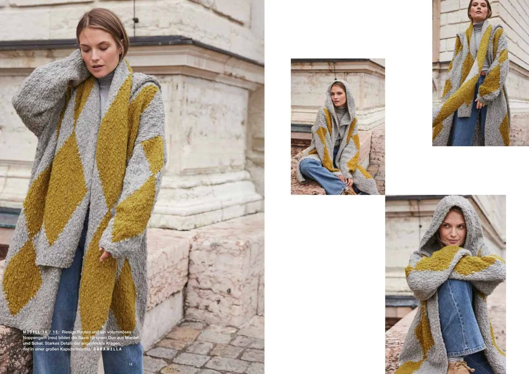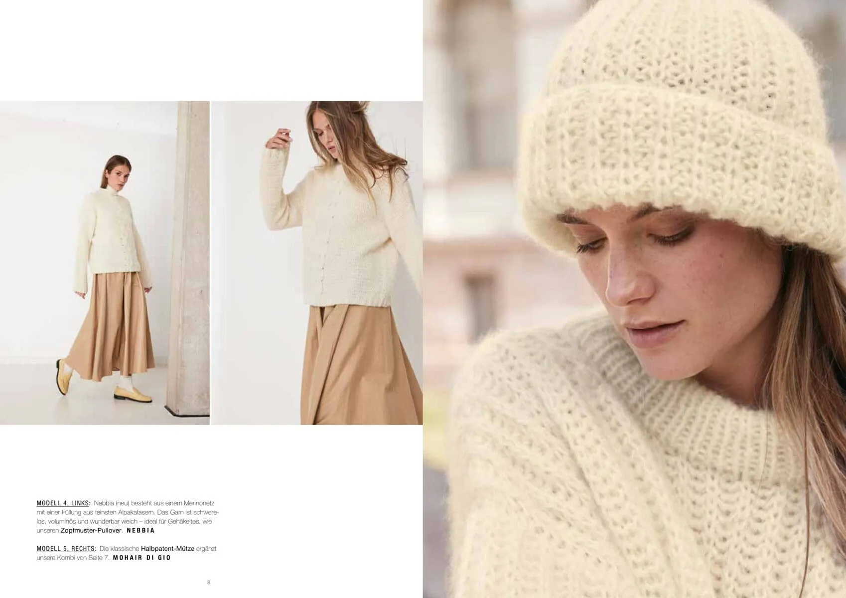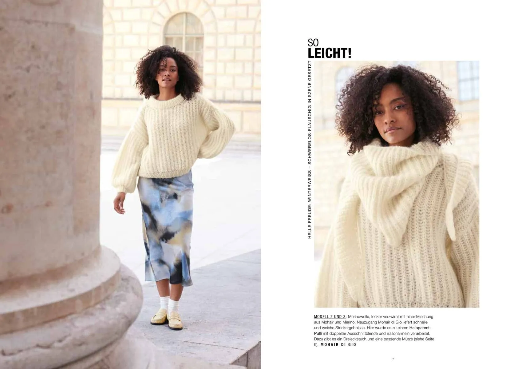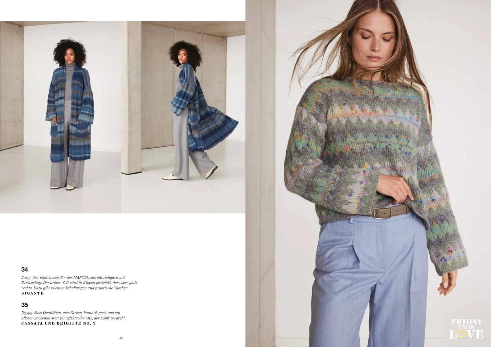 В коллекции — джемперы крупной вязки, объёмные кардиганы, жилетки, шарфы и шапки. Все изделия связаны из премиальных нитей Lana Grossa (Caramella, Mohair di Gio, Nebbia, Confetti и др.), которые позволяют варьировать уровень теплоты и комфорта.