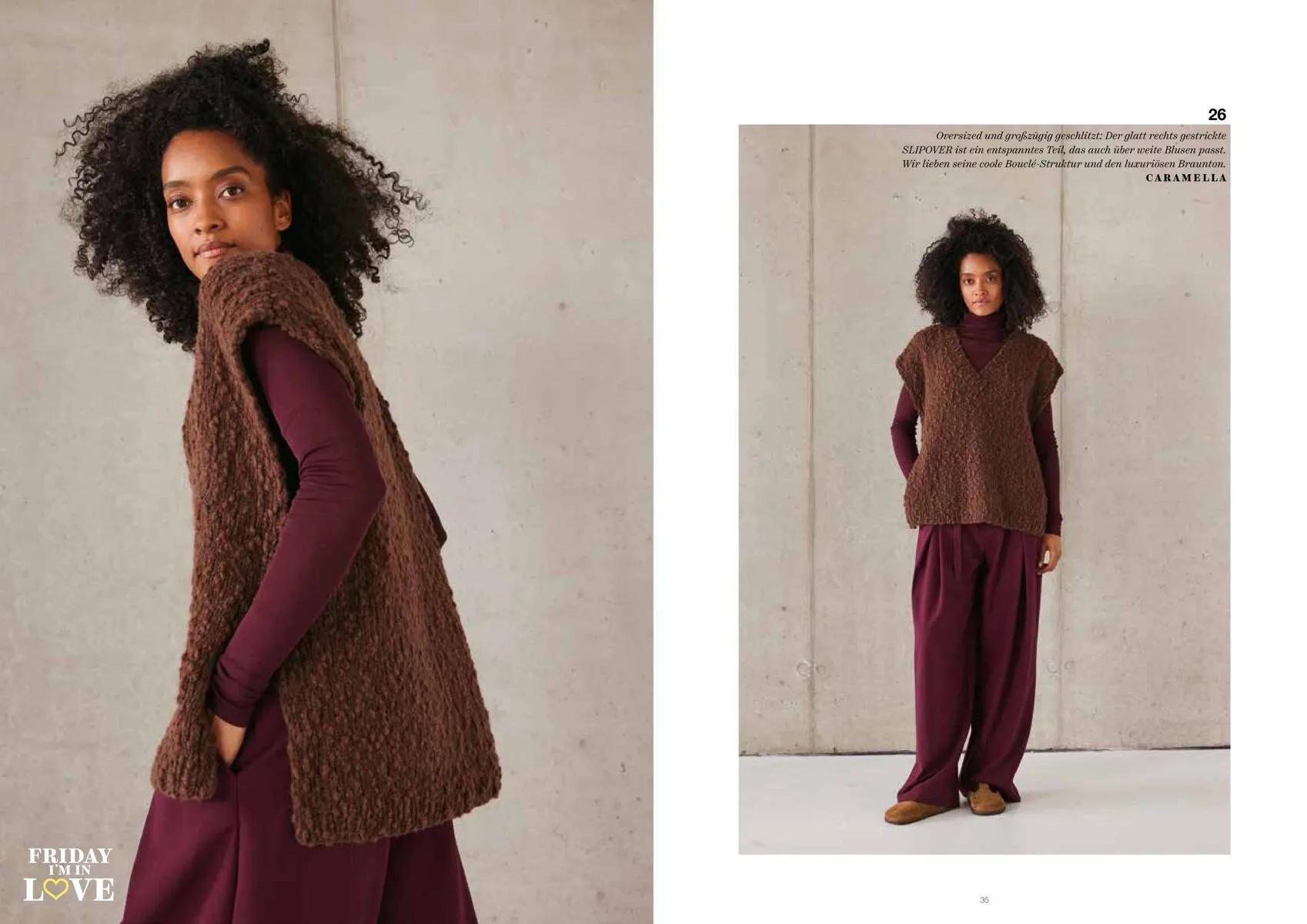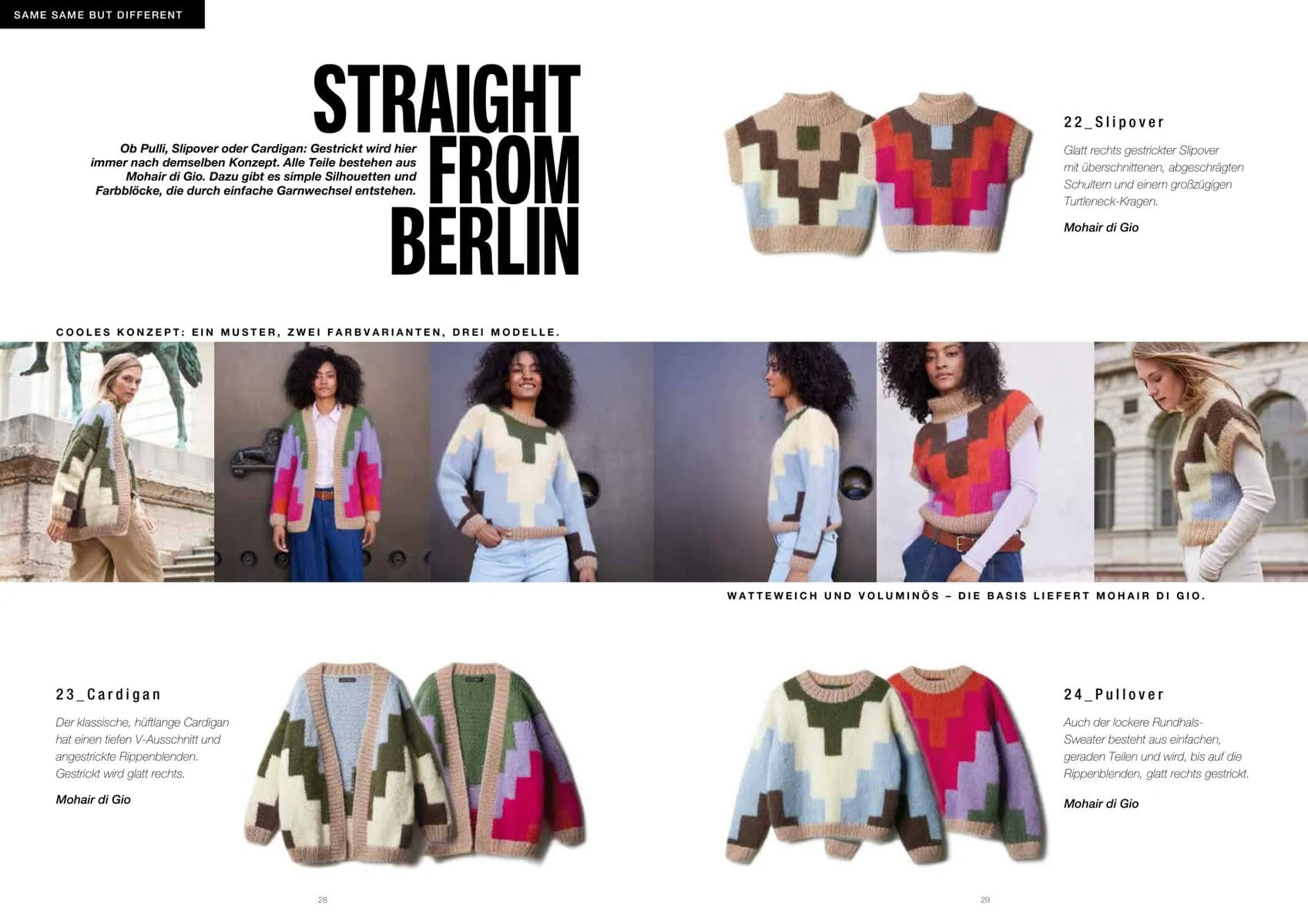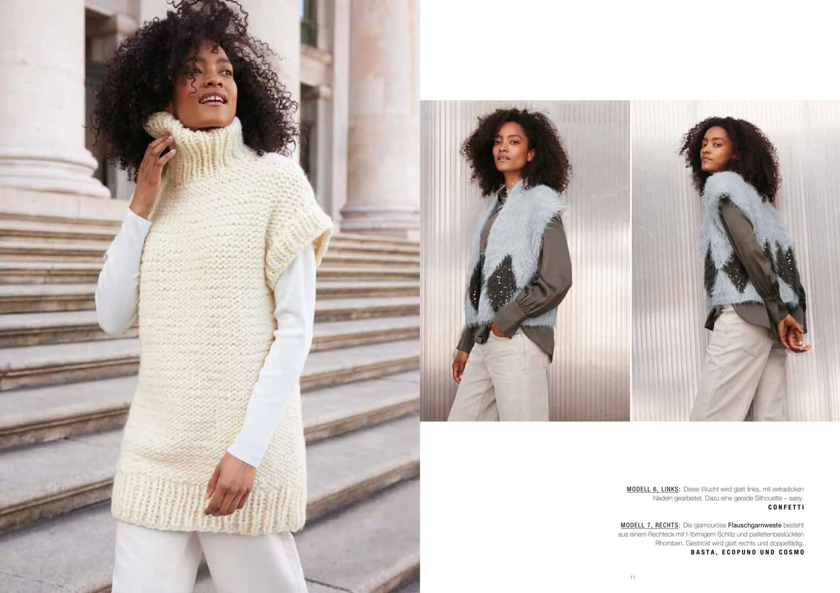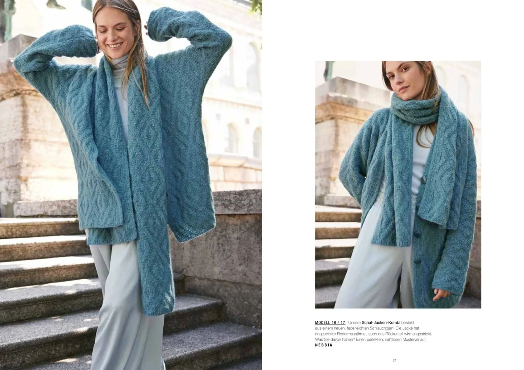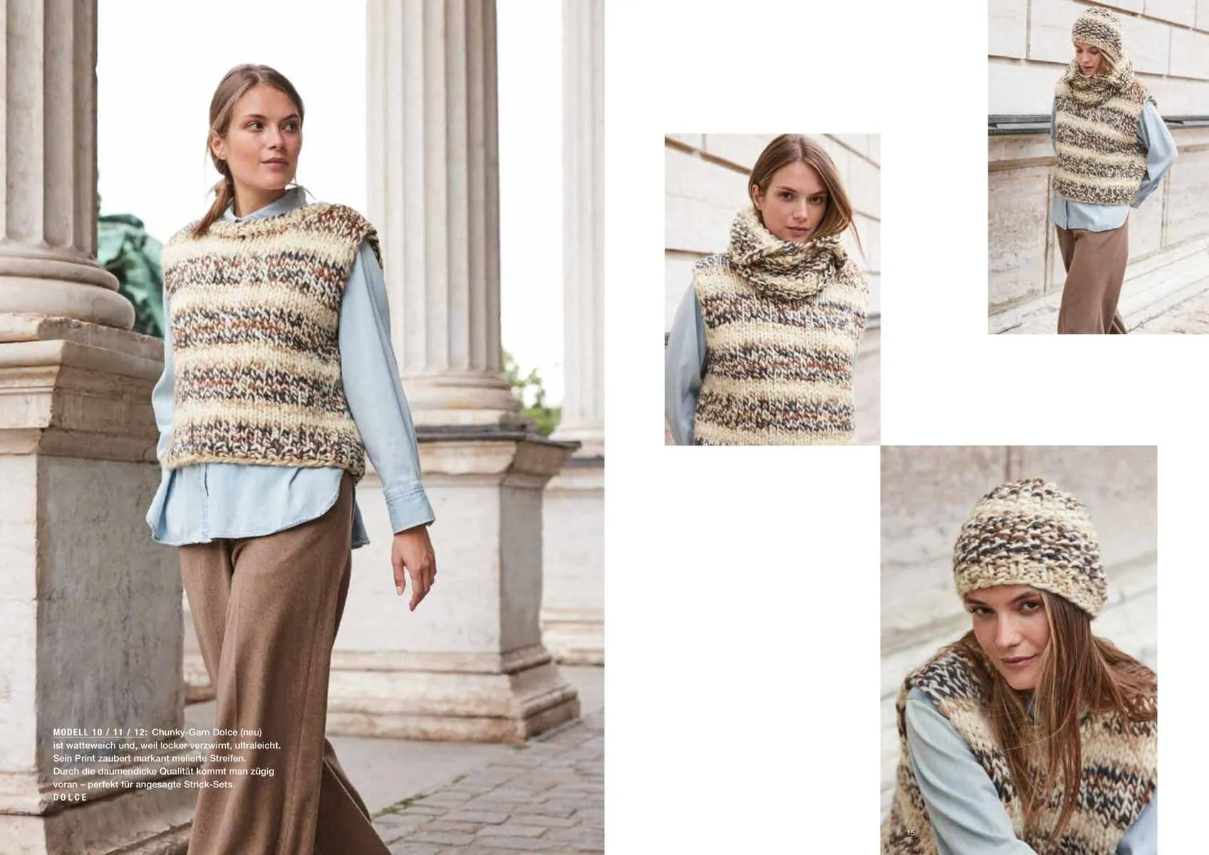 В коллекции — джемперы крупной вязки, объёмные кардиганы, жилетки, шарфы и шапки. Все изделия связаны из премиальных нитей Lana Grossa (Caramella, Mohair di Gio, Nebbia, Confetti и др.), которые позволяют варьировать уровень теплоты и комфорта.
