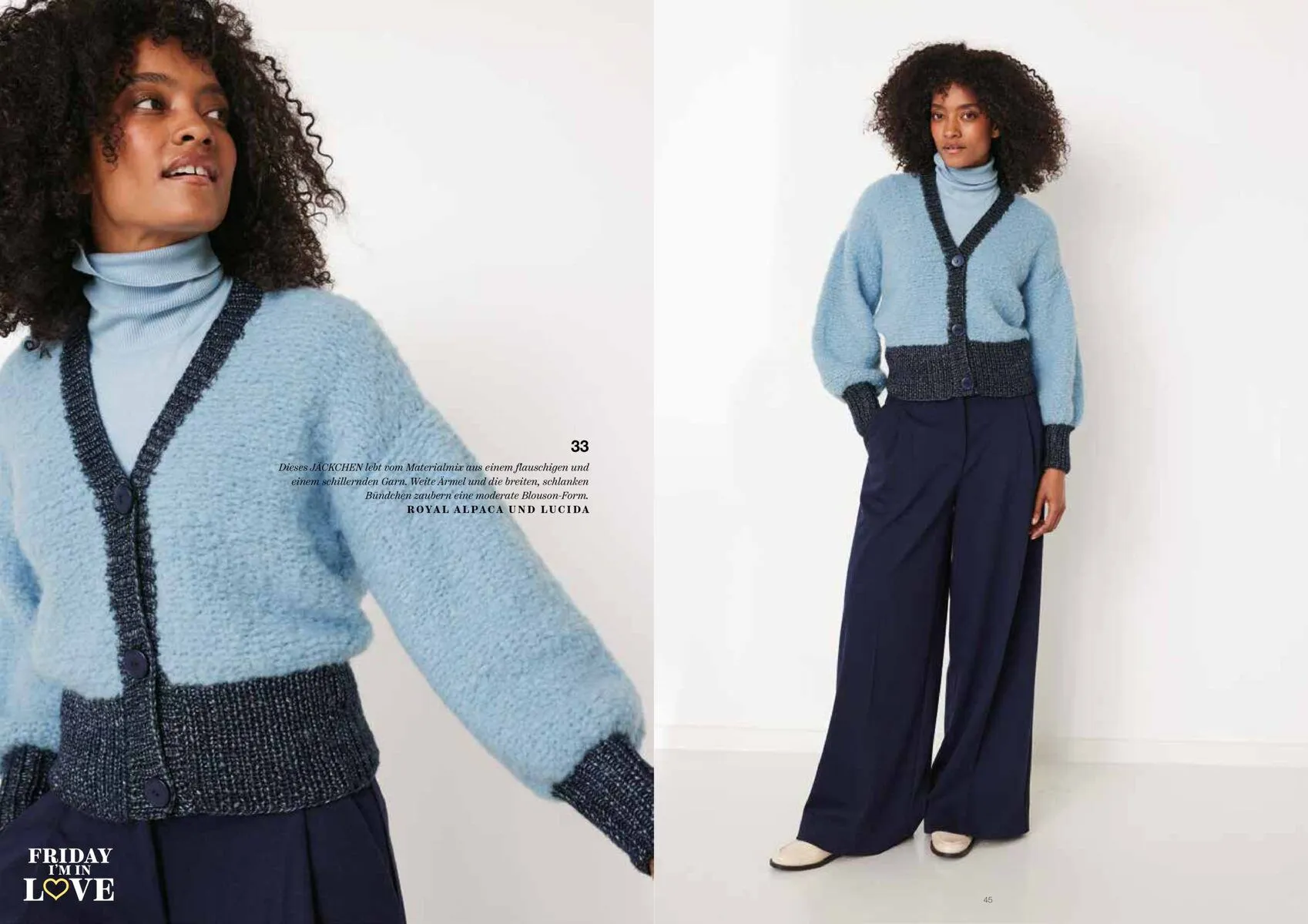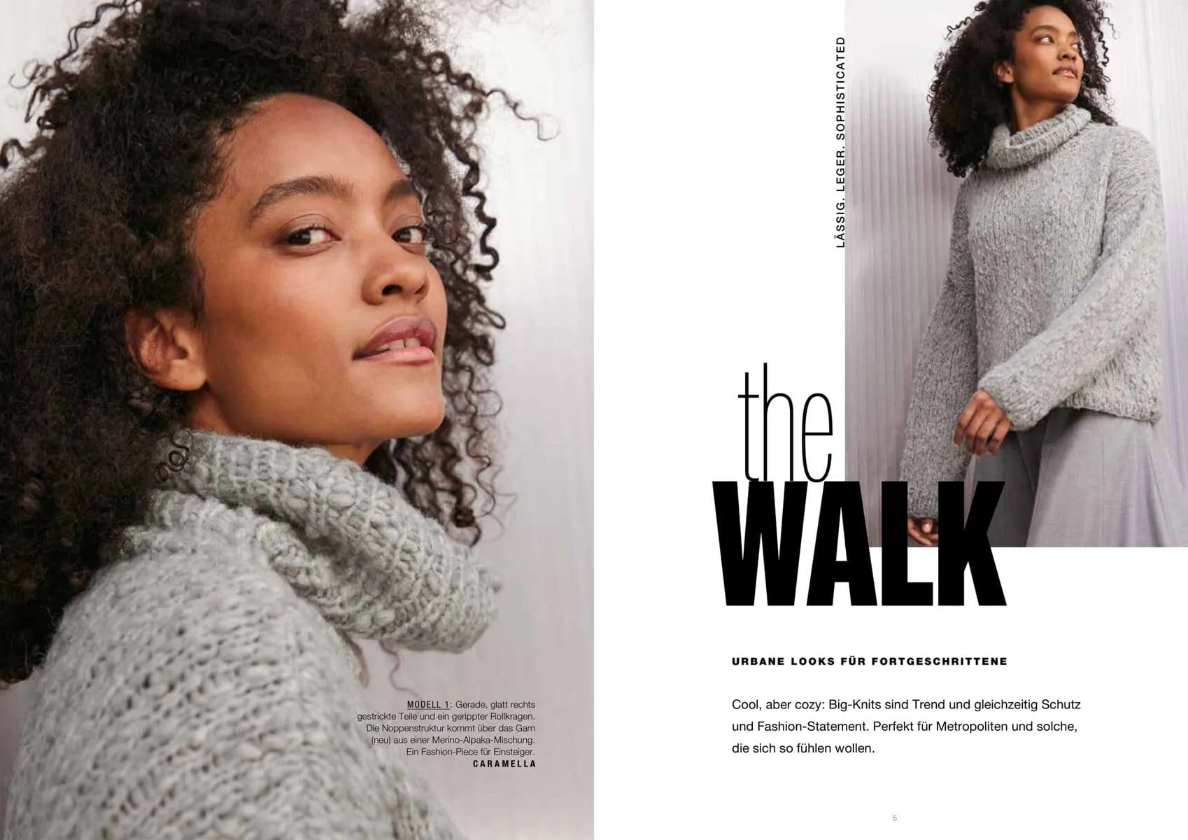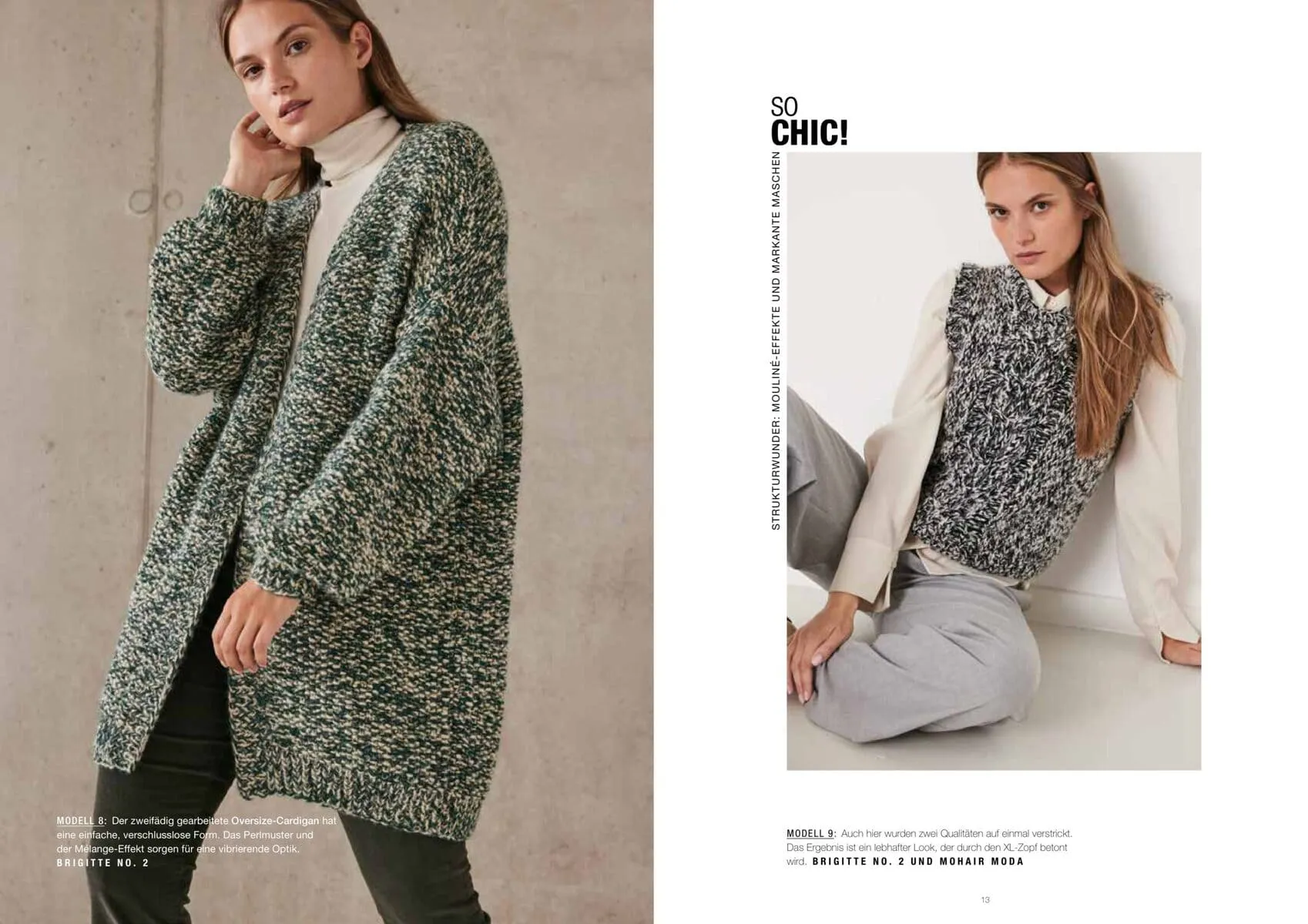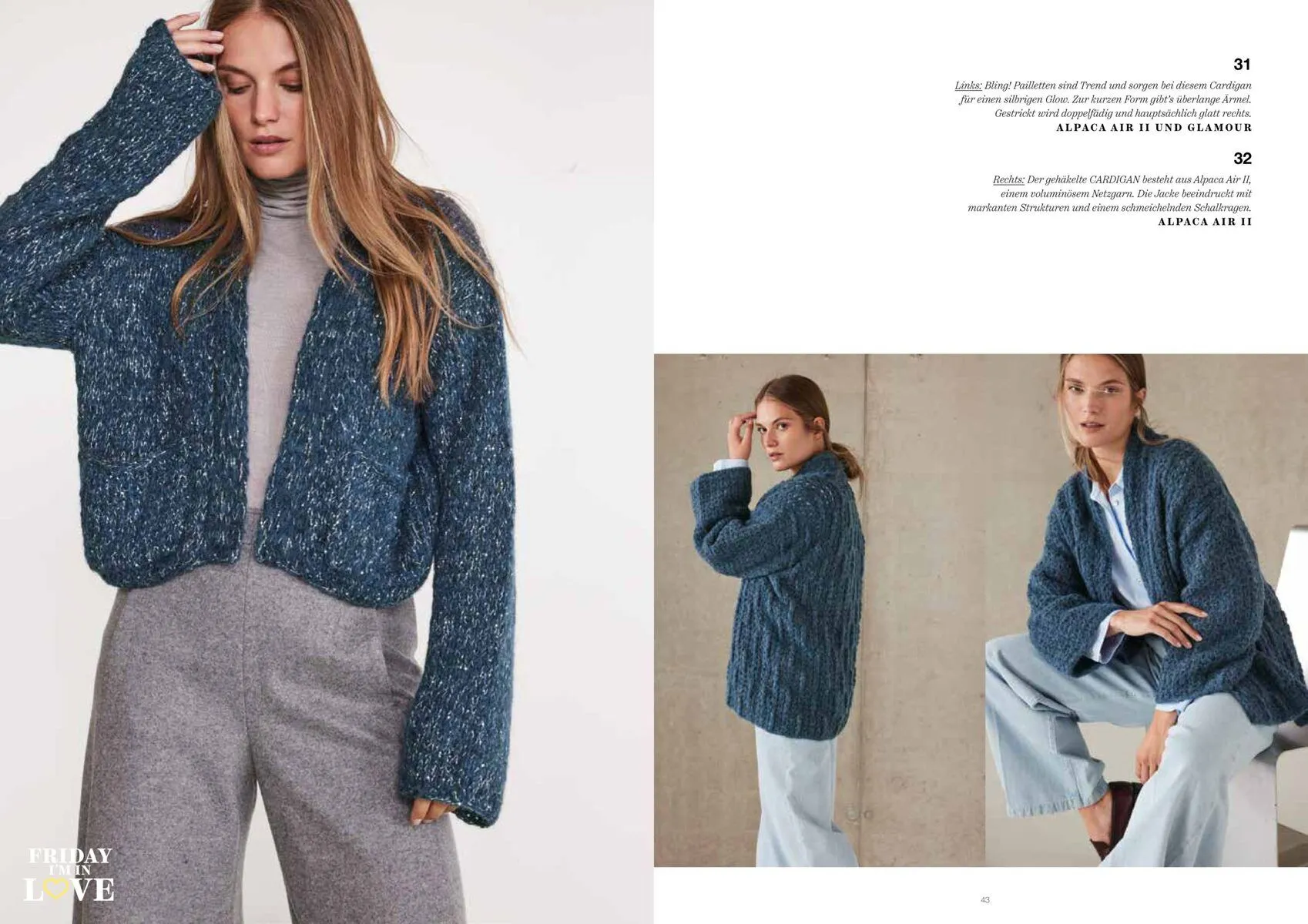 В коллекции — джемперы крупной вязки, объёмные кардиганы, жилетки, шарфы и шапки. Все изделия связаны из премиальных нитей Lana Grossa (Caramella, Mohair di Gio, Nebbia, Confetti и др.), которые позволяют варьировать уровень теплоты и комфорта.