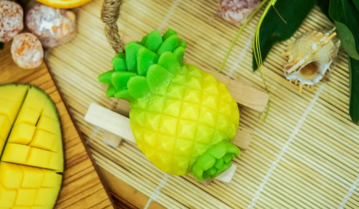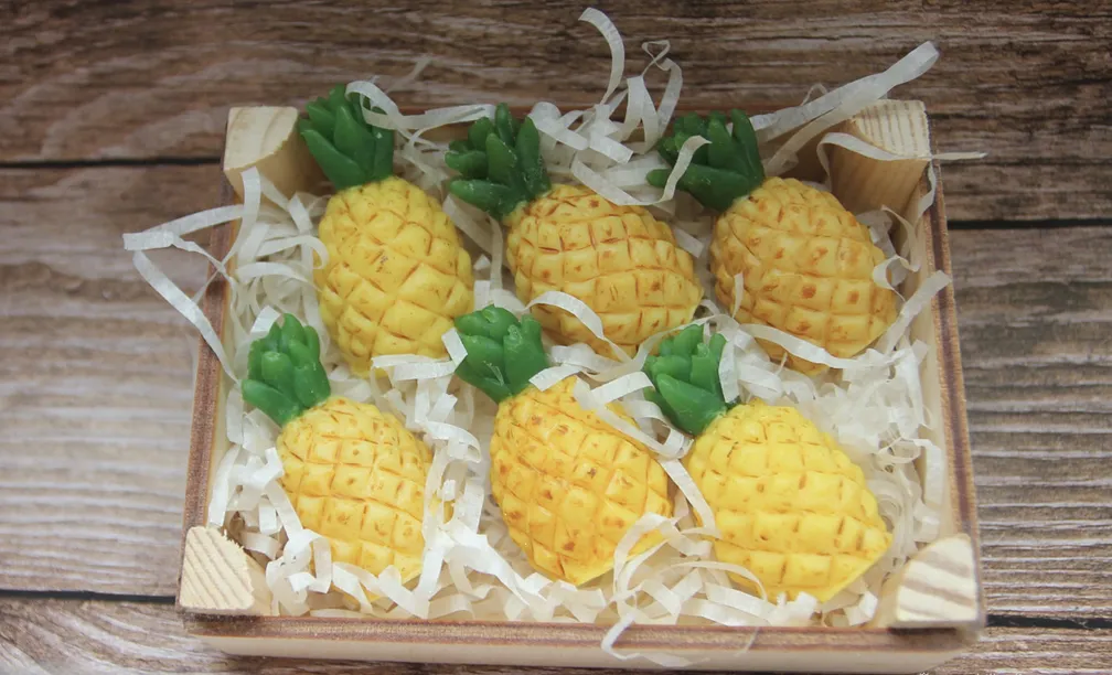 Можно подарить небольшой ящичек с ананасами из мыла, согласитесь, выглядит очень интересно и необычно. Также можно добавить ароматизатор для мыла с запахом ананаса, и тогда вообще создастся полное ощущение, что перед вами настоящие ананасы.