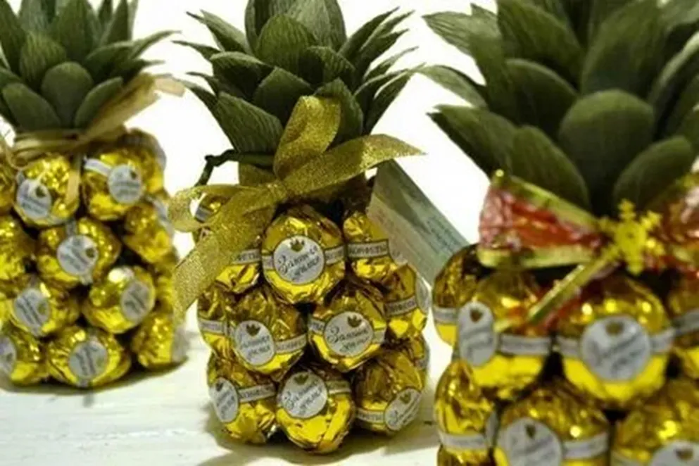 Ананасы из конфет уже являются классикой, такой презент легко можно сделать самому, а выглядит он очень красиво и эффектно. Причем преподнести такой подарок можно на любой праздник.