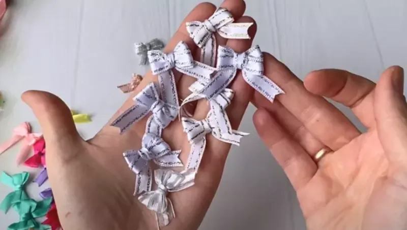 Бантик получается аккуратным и имеет плоскую форму. Мини-бантики можно сделать из лент разной ширины и цветов без вилки.