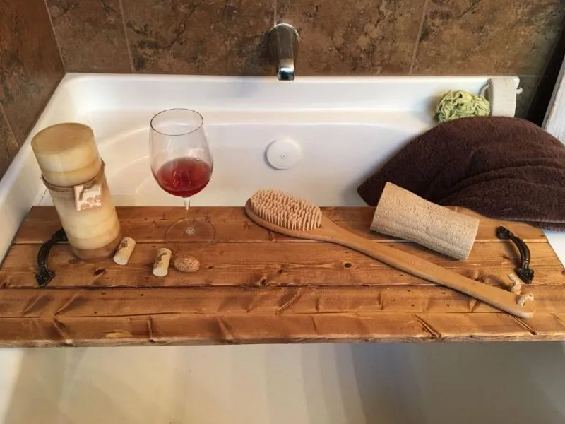 1. Полка на ванну в стиле рустик. Такая полка кладется поперек ванной и на нее можно ставить все, что захотите, например, свечи, книгу, бокал вина. Полку можно сделать из двух широких досок или нескольких поуже, предварительно отшлифовав и отпилив нужную длину. С обратной стороны доски можно соединить двумя или несколькими брусками.