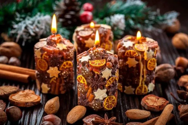 1. Свечи. Определенно точно, свечи можно купить в любом магазине, но куда лучше сделать свечи с любовью своими руками. Украсить их можно как угодно: сушеными лепестками, ягодами, дольками апельсинов, бусинами, стразами, еловыми веточками.