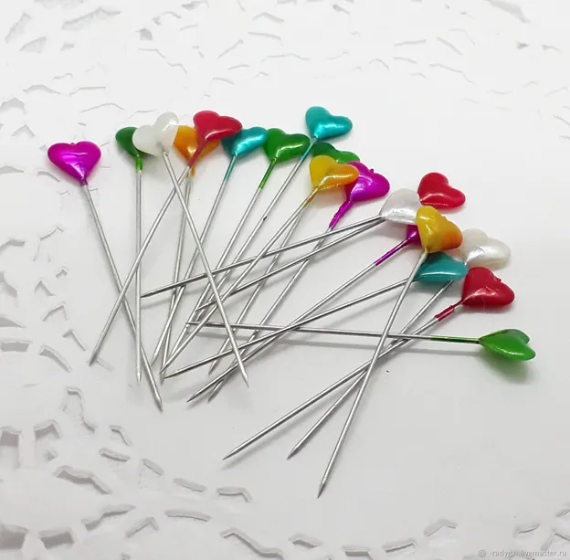 Булавки для тонких тканей отличаются от обычных: они длиннее, тоньше, кончики очень острые и головки обычно из стекла. Такие булавки не оставляют следов и не делают зацепок на деликатных тканях.
