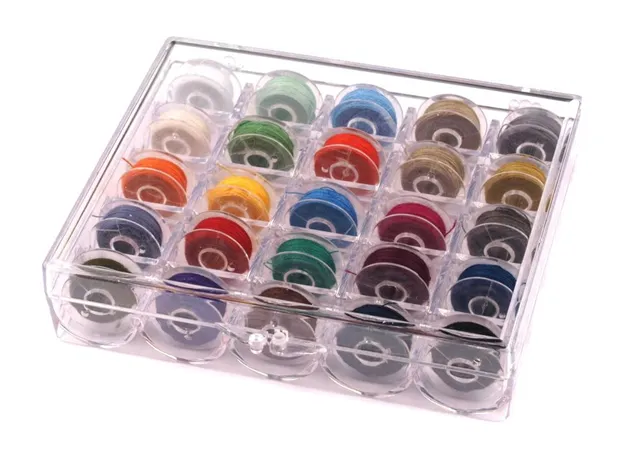 Благодаря боксу для шпулек можно сразу увидеть, какие шпульки свободны, а какие уже есть и готовы к работе. Такие боксы есть и для ниток. За счет того, что они прозрачные, все хорошо видно.