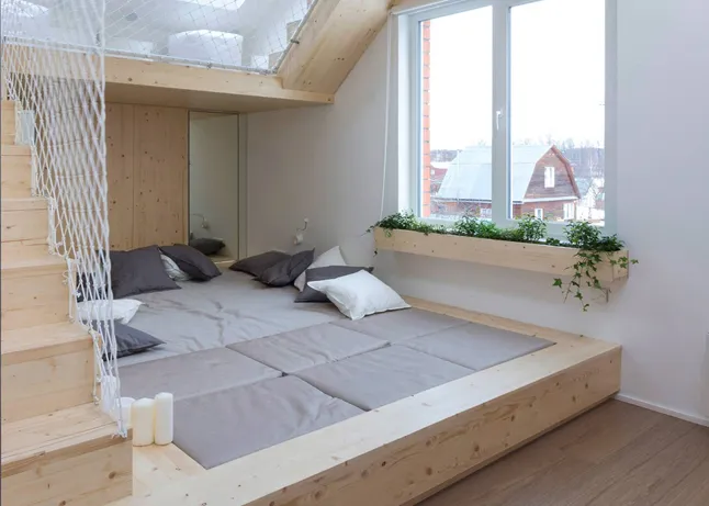 Возьмите обычный деревянный каркас, можно сделать подиум и сверху просто положите любой пружинный матрас, и вот, ваша зона отдыха готова. Взяв несколько таких матрасов, можно сделать угловой диван и сверху положить диванные подушки, которые есть в каждом доме, а если нет, то они недорого стоят в магазине.