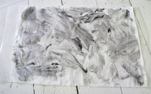 6. Перемешайте эту пену с пеной с краской, которую вы выдавили до этого. Если вы видите, что на весь отрез ткани пены не хватает, то добавьте еще. Пена должна равномерно покрывать всю пленку.