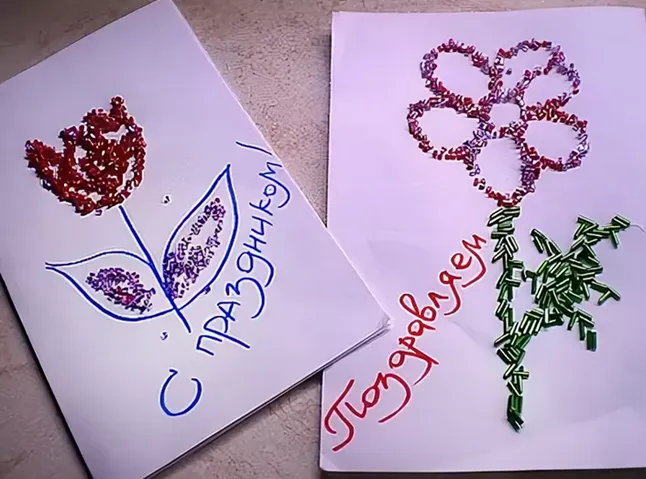 - Картина на основе пустой открытки. Рисунок и надпись на открытке вы можете сделать как внутри нее, так и снаружи. Прежде все намажьте клеевым пистолетом или кисточкой, смазанной клеем, те символы и буквы, которые хотите выделить с помощью бисера. Возьмите бисер нужного цвета и посыпайте клеевые участки бисером, потом дайте высохнуть. Открытка готова, оригинально, объемно и красиво.