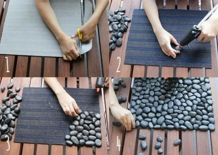 Очень интересная идея сделать коврик из гальки для дома, такой коврик выглядит эффектно, но еще и носит полезный массажный эффект.