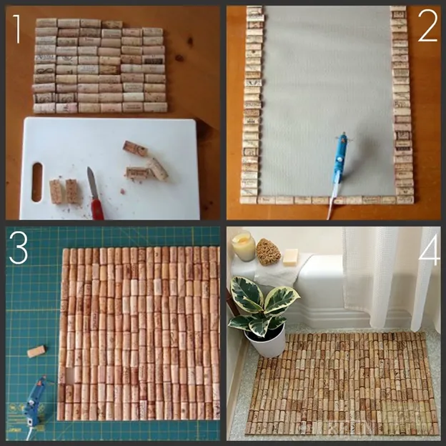 Если в доме накопилось много пробок от вина, можно их использовать при создании коврика для ванны. Ведь пробка – отличный материал для ванной комнаты, т.к. устойчив не только к воде, но и к различным микроорганизмам.