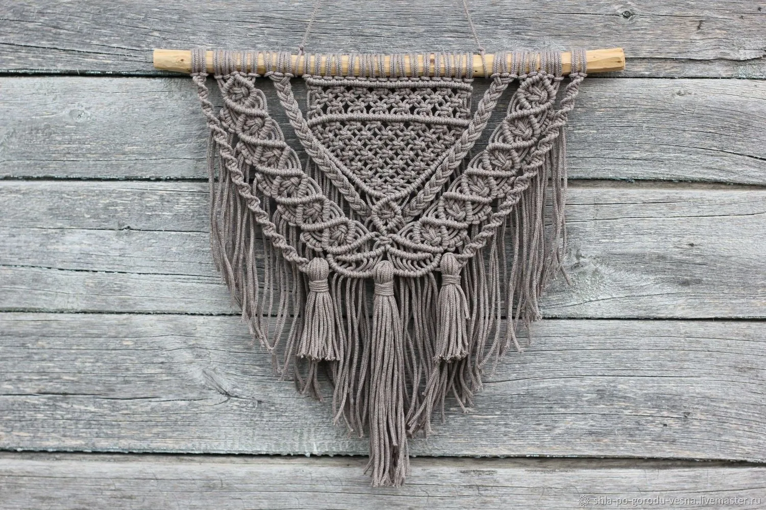 Панно – это самый популярный и простой предмет, который можно создать в технике макраме. В качестве основы для панно можно взять веточку дерева. Так ваше панно будет выглядеть модно и стильно.