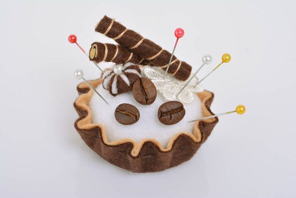 Игольница в виде пирожного – прекрасный подарок для тех, кто любит шить и вышивать. Причем, если сделать к ней чехол в виде мороженого, то получится отличный комплект.