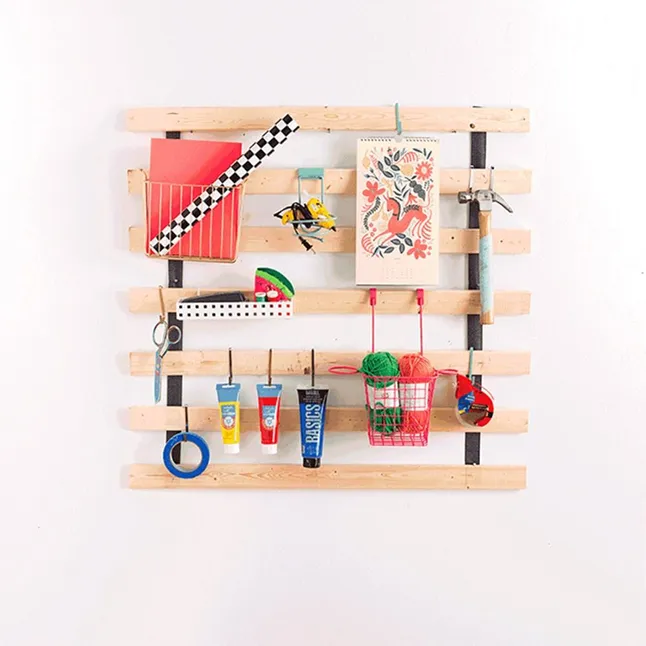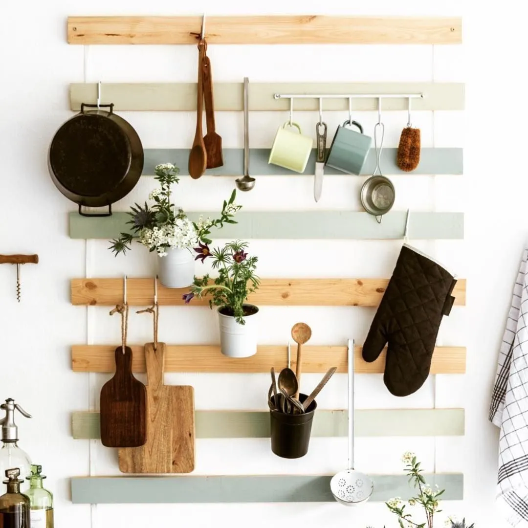 Настенное хранение можно сделать довольно бюджетным и не затратным, благодаря деревянным рейкам. Из реек вы можете сконструировать органайзер там, где он вам необходим, например, на кухне или в кабинете. Чтобы интерьер выглядел еще эффектнее и красочнее можно добавить крючочки, корзинки и полочки.
