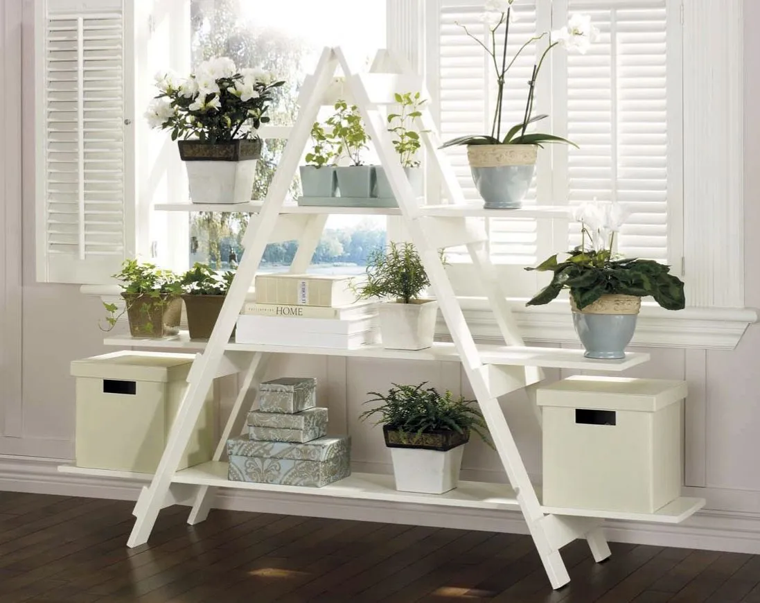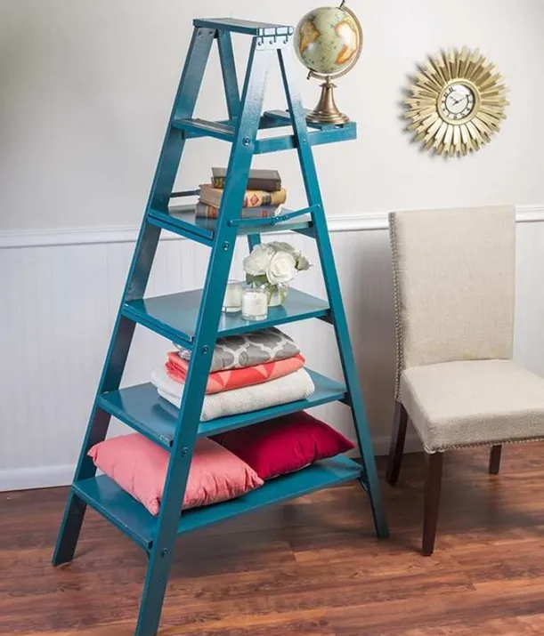 Бывает, что мелких предметов интерьера или книг собралось столько, что не умещаются в доме. И нужен новый шкаф или стеллаж. Предлагаем не бежать покупать его в магазин, а сделать стеллаж своими руками из старой лестницы. Наверняка, у многих есть такая на даче.