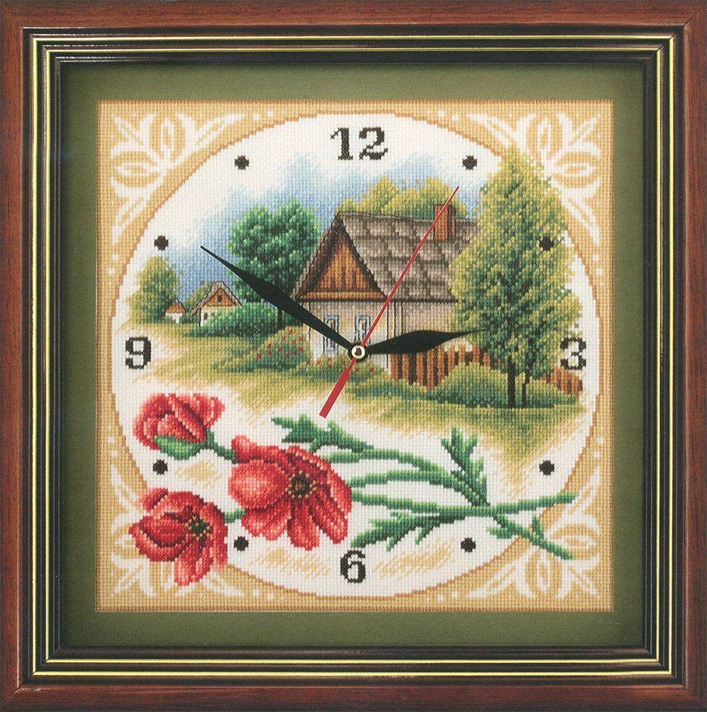 Вышивкой можно оформить настенные часы. Тут все довольно просто: разбираем свои часы и вместо задней стенки приклеиваем вышивку в картонной рамке. После этого в центре делаем отверстие, где прикрепляем стрелки.