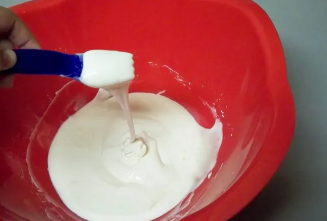 - Налейте в емкость клей. Далее добавьте крем, перемешайте, и масло, также перемешав.