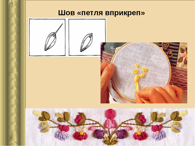 Стежок вприкреп используют в основном для того, чтобы заполнить большие площади узоров одним цветом, или близких оттенков, также такими стежками вышивают, когда основная масса рисунка вышита.