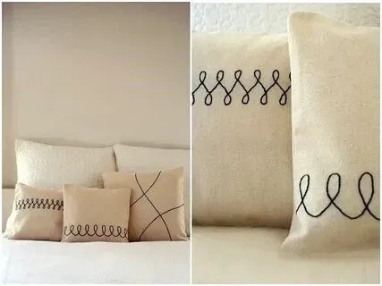 Новизну декору можно добавить благодаря декоративным подушкам, например, вышить оригинальный комплект из трех подушек в технике каракули, как будто мы ручкой нарисовали на листочке бумаги.
